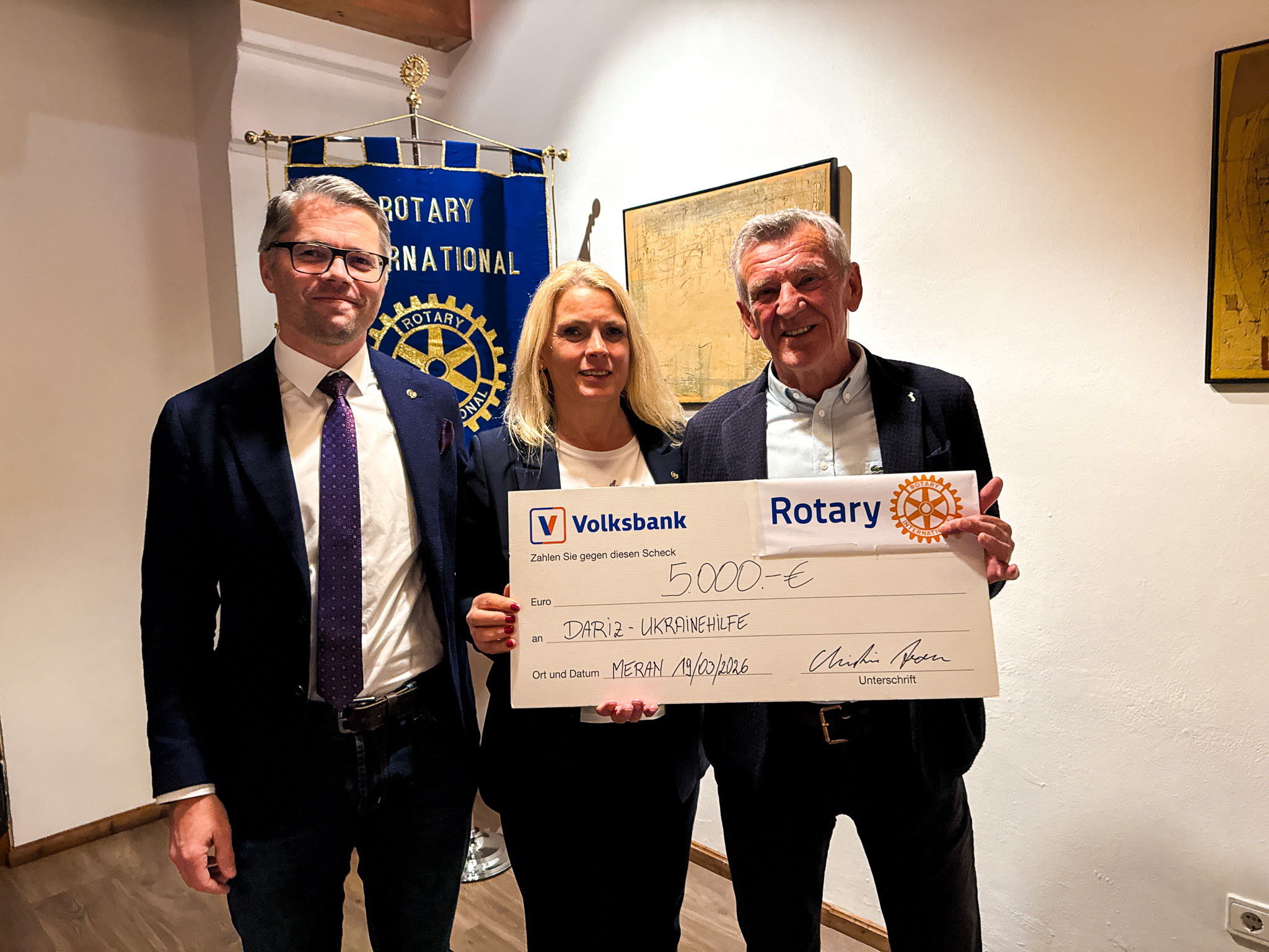 Als Zeichen der Unterstützung überreichte der Rotary Club Meran eine Spende von 5.000 Euro für den Ankauf dringend benötigter Medikamente – ein Beitrag, um dort zu helfen, wo Hilfe unmittelbar ankommt.